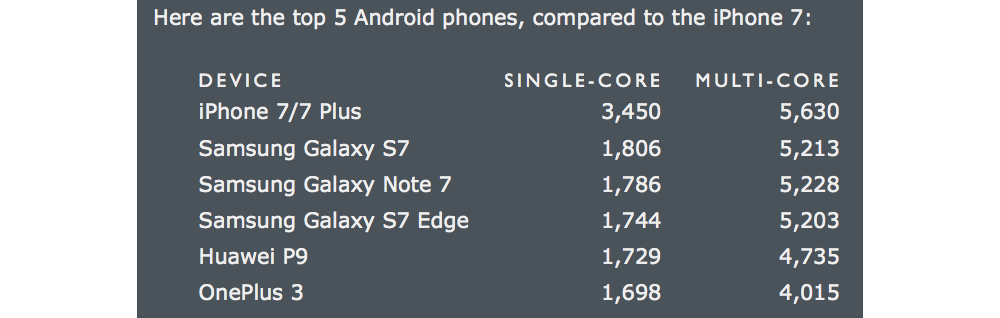 【泽鸣租赁】A10 Fusion 芯片有多逆天?近日 Daring Fireball 网站的 John Gruber 就让 iPhone 7/7 Plus 和安卓的旗舰机型们进行了一次对比,结果发现 iPhone 7/7 Plus 不仅仅在多核性能得分方面领先,在单核得分方面更是一骑绝尘。