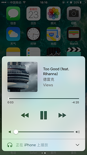 如图,当你调出控制中心时,第一眼就能够感受到它的变化了:音乐播放控制按键全都不见了,不过只要向左轻扫,你就可以看到苹果在控制中心里为这些控制键专门设计的页面了。在控制中心第一屏中,第一栏还是我们熟悉的那几个按键:飞行模式、Wi-Fi、蓝牙、Do Not Disturb 和旋转锁定。第二栏还是屏幕亮度滑块。