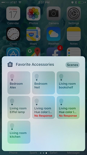 同样地苹果支持用户对 HomeKit 配件使用 3D Touch 手势操作,比如在智能灯泡图标上用力按下去即可调出亮度控制条,以及调整颜色的链接。