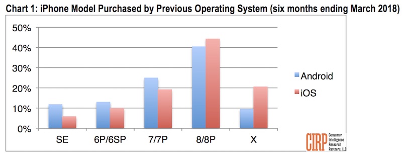 日前,专注消费者消费情况调研的机构 CIRP 发布了最新研究报告。根据报告了解,从安卓跳槽而来的 iPhone 用户每一季度都非常多,占当季 iPhone 销量 15% 到 20%,不过选择老 iPhone 机型的整体比例较大,iPhone X 并非这类用户的首选,而且这类用户往往会选择大屏幕款 iPhone 机型。